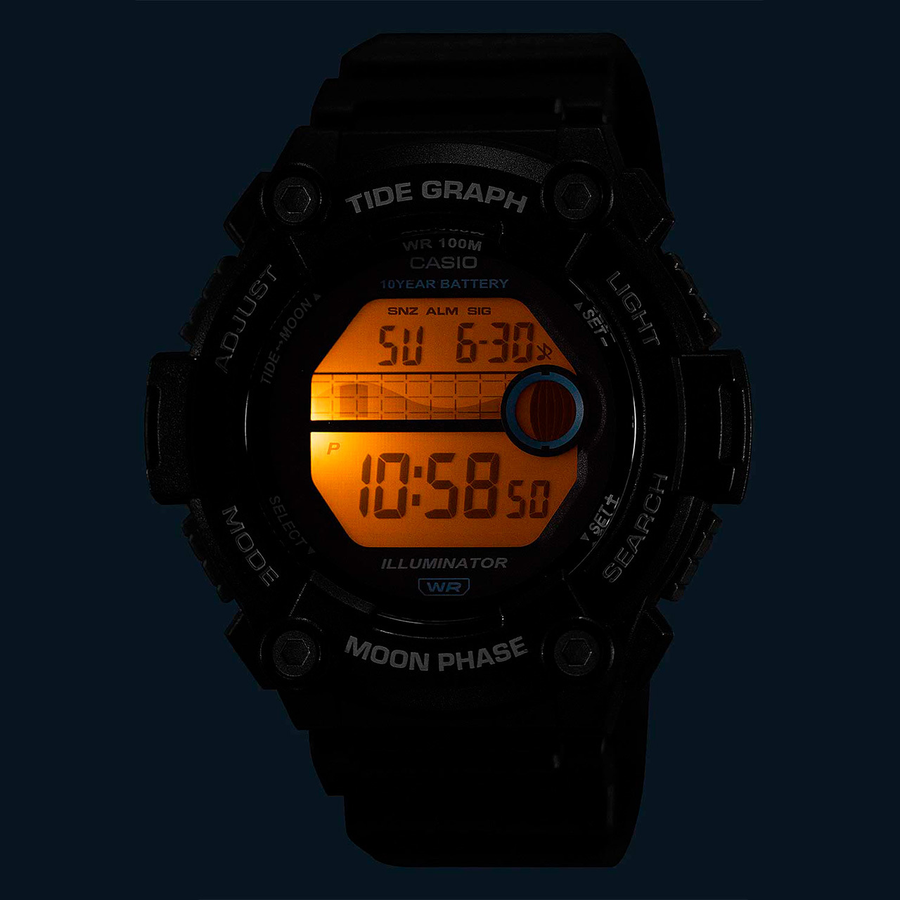 Функции: Цифровой дисплей. Будильник. Второй часовой пояс. Указатель фаз луны. Секундомер. Tаймер обратного отсчета. День недели. Месяц. Число. График приливов и отливов. Отображение возраста Луны на конкретную дату и графика фаз Луны.