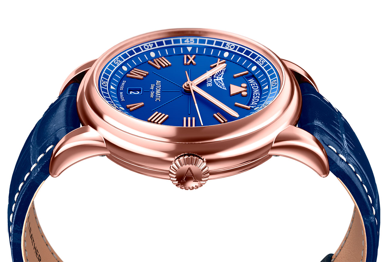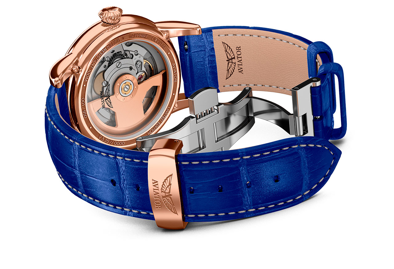 Сердцем часов стал новый калибр AVIATOR AV-1000 на основе известного швейцарского механизма Sellita SW240-2. Эта модель сочетает изящность оформления с высокой функциональностью. В часах предусмотрена функция отображения дней недели и дат, а значит, сверяться с календарем будет проще. Система Incabloc обеспечивает превосходную устойчивость к ударам и падениям. Ротор механизма увеличен и выполнен с особой тщательностью, воспроизводя узор циферблата для отражения стиля ар-деко даже на задней крышке часов.