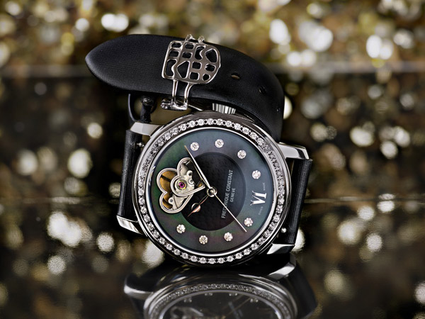 Среди женских моделей также обратила на себя новинка Black Beauty из коллекции Double Heart Beat от Frederique Constant. Эффектное сочетание - глубокий черный цвет перламутрового циферблата и россыпь бриллиантов. Дизайн циферблата с отверстием в форме двух слившихся сердец, сквозь которое видно "биение пульса" часового механизма, запатентован.
