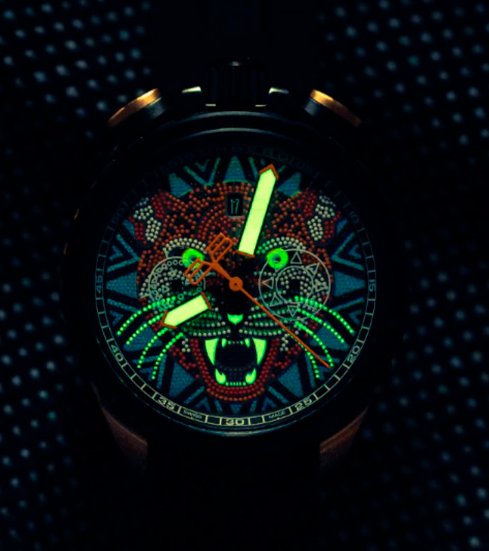 Узоры майя на браслетах и корпусах символизируют элементы мифологии этого народа. В узорах, нанесенных на корпуса и браслеты часов Bomberg, отражены элементы этой мифологии – безель обвивают ветви дерева якче, а на браслетах раскрываются его цветы и листья.
