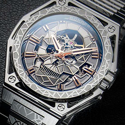 Главный визуальный элемент - это 3D-скелетонизированный череп на циферблате, выполненный в технике многослойного оформления. Этот эффект напоминает витражное искусство , создавая динамичный и выразительный облик. В центре циферблата, на уровне 12 часов , можно увидеть колесо баланса , которое напоминает бьющееся сердце механизма.