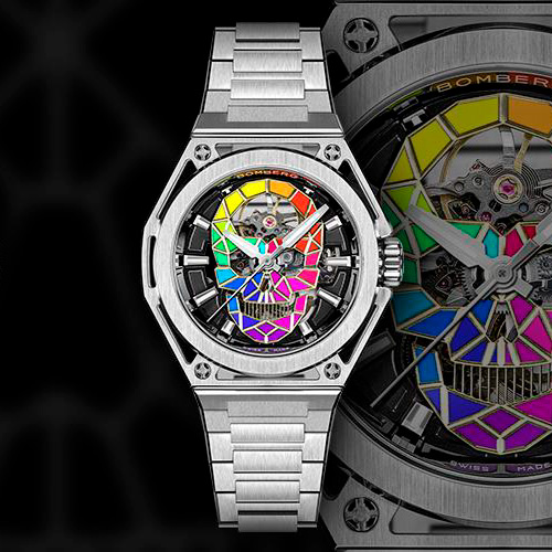 - Циферблат: Скелетонизированный, череп из цветных сегментов.