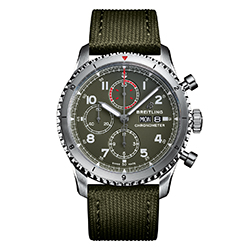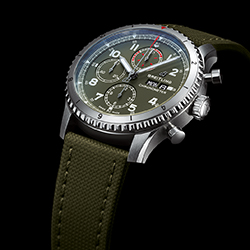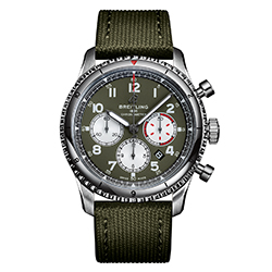 Хронометр, прошедший сертификацию COSC, обладает водонепроницаемостью до 10 бар (100 м) и оснащен армейским ремешком цвета хаки.
