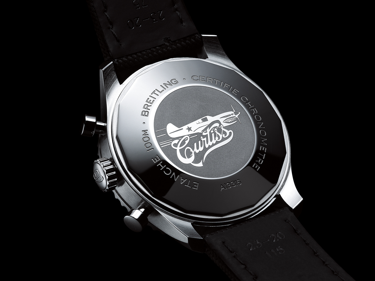 Задняя крышка хронографа украшена гравировкой Curtiss и изображением боевого самолета P-40 Warhawk.