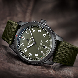 Хронометр, сертифицированный Швейцарским институтом официального тестирования хронометров (COSC), имеет корпус из нержавеющей стали диаметром 43 мм и ремешком цвета хаки. Водонепроницаемость часов – до 10 бар (100 м).