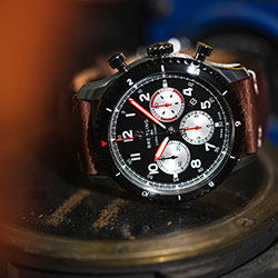 На яркую центральную часовую стрелку оранжевого цвета, а также минутную и центральную секундную стрелки нанесено люминесцентное покрытие по технологии Super-LumiNova®, которое гарантирует удобство считывания времени при любом уровне освещенности. Динамичные красно-оранжевые акценты напоминают опознавательные знаки на фюзеляже самолетов de Havilland Mosquito и подчеркивают уникальный характер модели. Стрелка малого секундного счетчика покрыта черным лаком. На циферблате в положении между «4» и «5» часами находится окошко индикации даты.