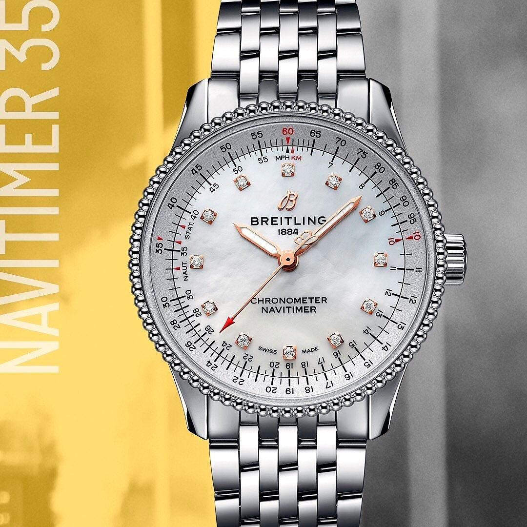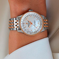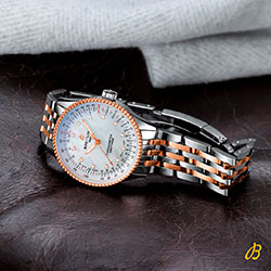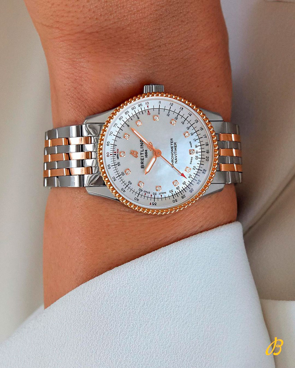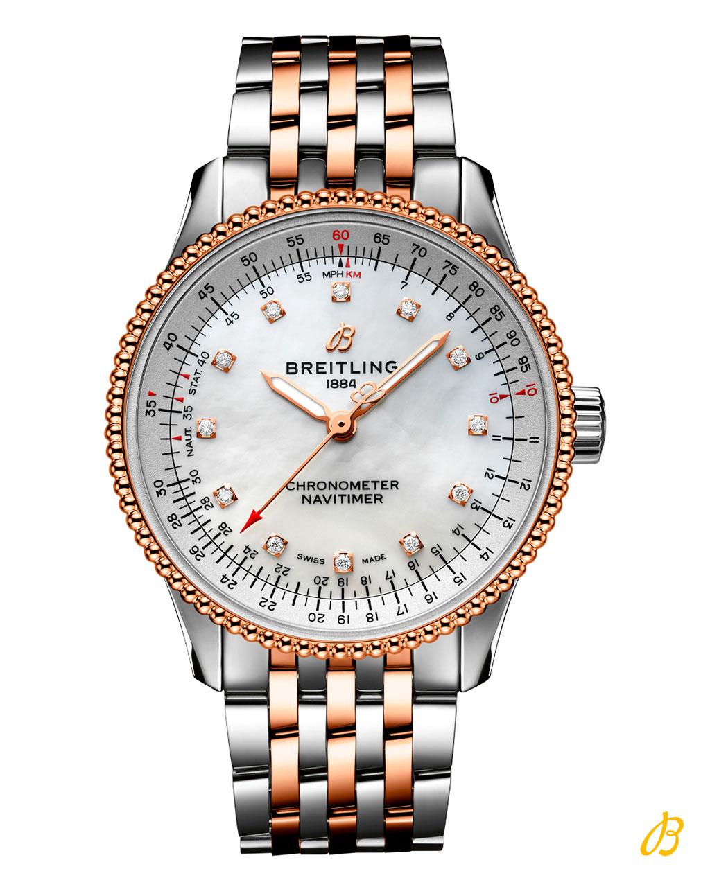 Компания Breitling также предлагает биколорные Navitimer Automatic 35 с корпусом из нержавеющей стали диаметром 35 мм и роскошным, вращающимся в оба направления безелем из 18-каратного розового золота. Циферблат из белого перламутра декорирован бриллиантовыми часовыми метками. Ремешок из кожи аллигатора коричневого цвета оснащен классической или раскладной застежкой. Кроме того, часы доступны с биколорным браслетом Navitimer из нержавеющей стали и 18-каратного розового золота с раскладной застежкой.
