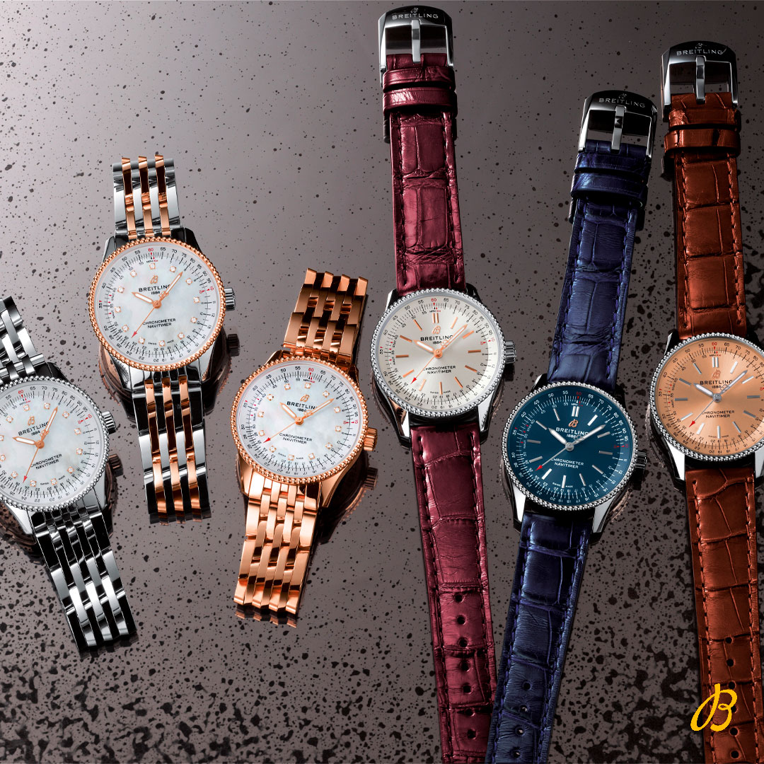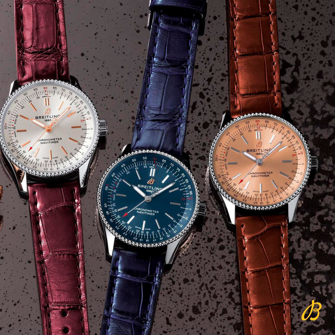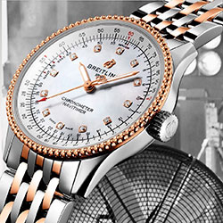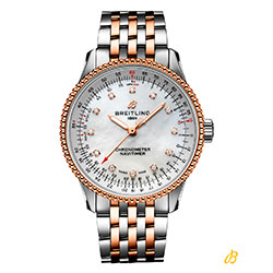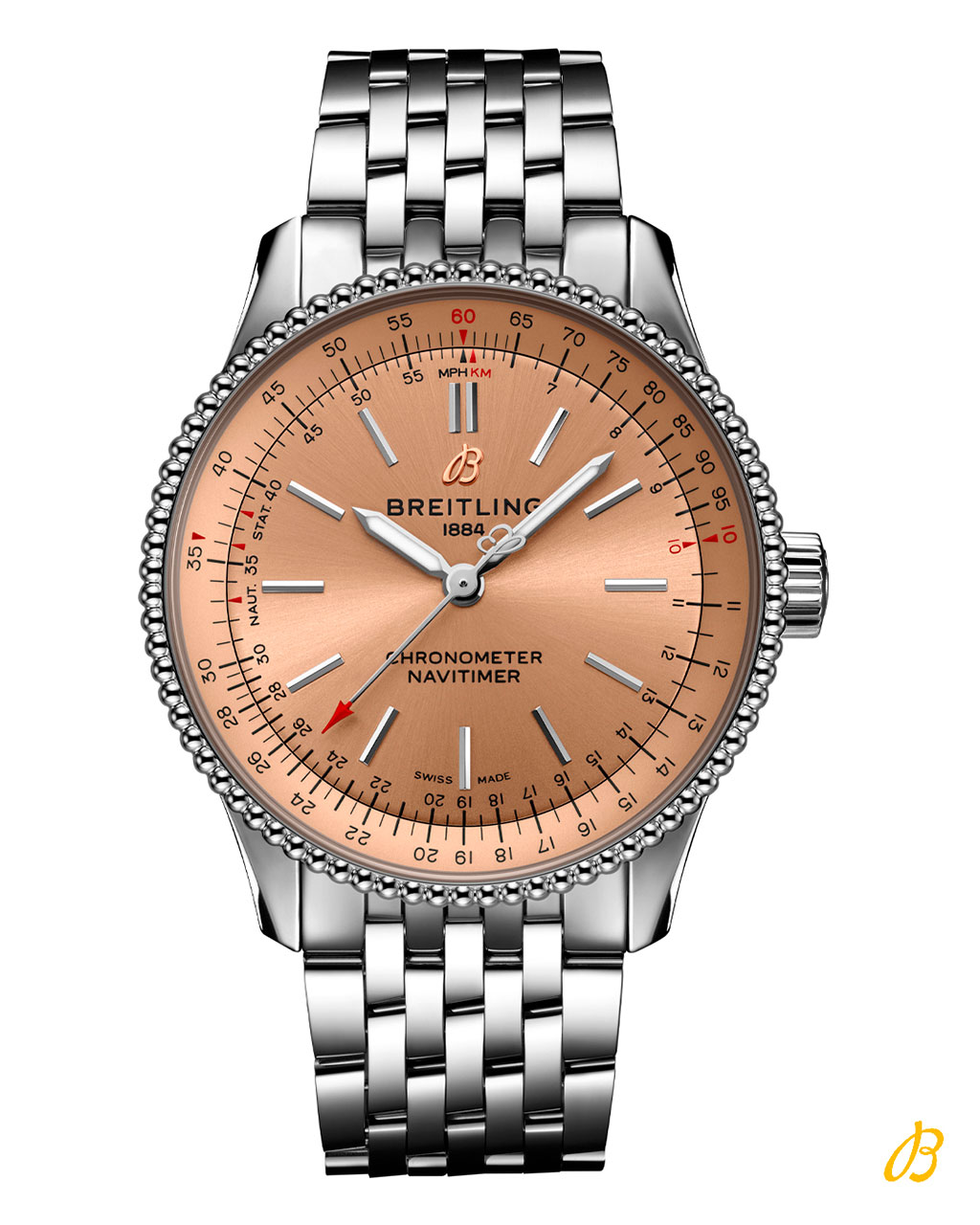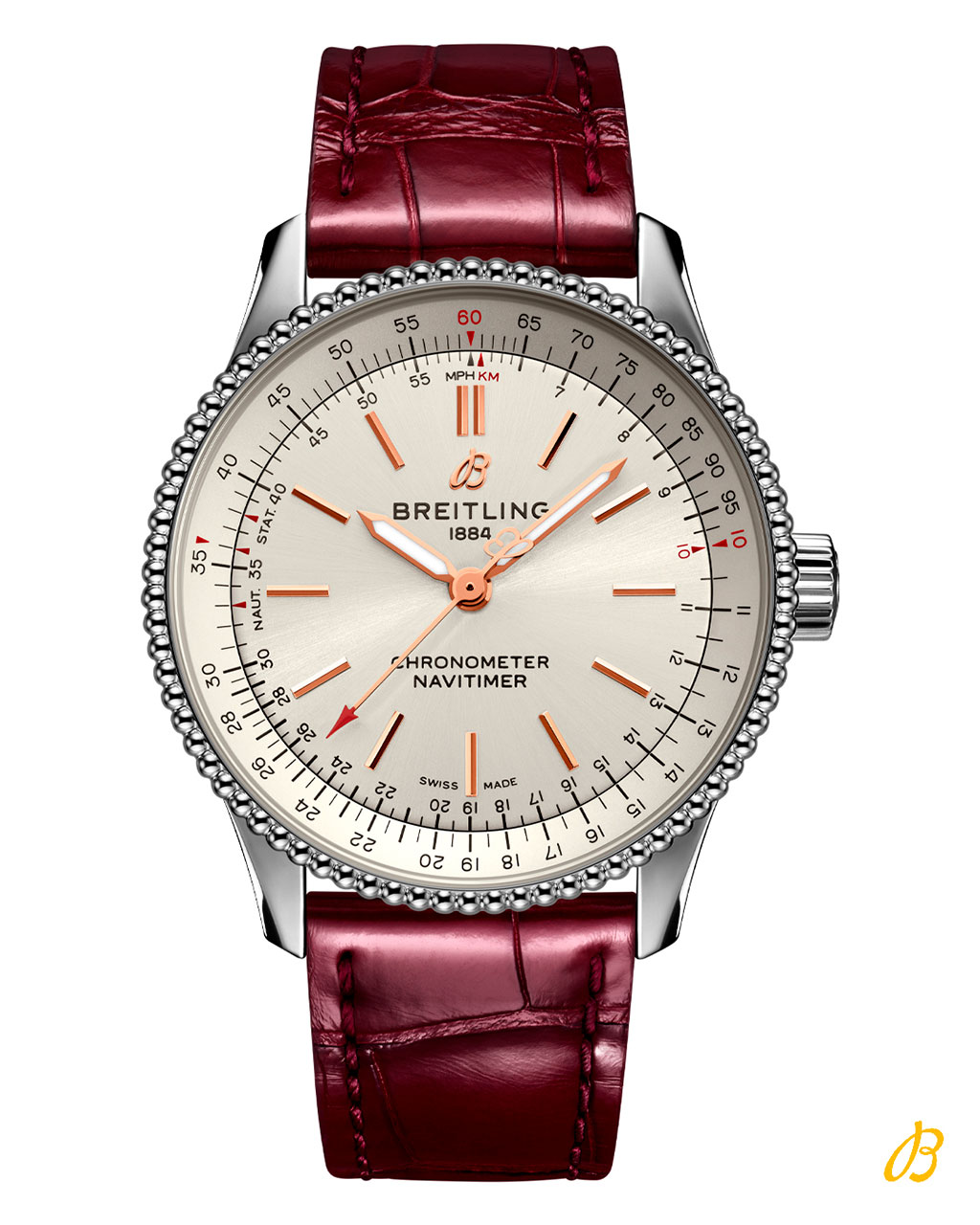 Компания Breitling также предлагает биколорные Navitimer Automatic 35 с корпусом из нержавеющей стали диаметром 35 мм и роскошным, вращающимся в оба направления безелем из 18-каратного розового золота. Циферблат из белого перламутра декорирован бриллиантовыми часовыми метками. Ремешок из кожи аллигатора коричневого цвета оснащен классической или раскладной застежкой. Кроме того, часы доступны с биколорным браслетом Navitimer из нержавеющей стали и 18-каратного розового золота с раскладной застежкой.