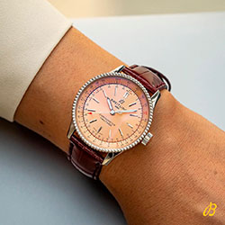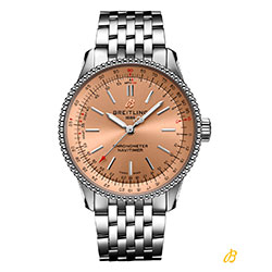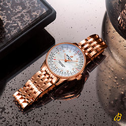Ценительницам изящных часов также предлагается версия в корпусе из 18-каратного розового золота с белым перламутровым циферблатом и бриллиантовыми часовыми метками. Великолепные часы дополняет ремешок из кожи аллигатора коричневого цвета с классической или раскладной застежкой из 18-каратного розового золота либо браслет Navitimer, изготовленный из 18-каратного розового золота, с клипсой-бабочкой. Стоит отметить, что к любой из версий могут быть дополнительно приобретены ремешки из кожи аллигатора необычных цветов – зеленого и золотистого.