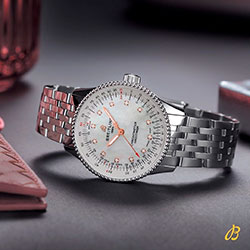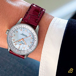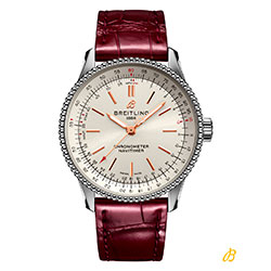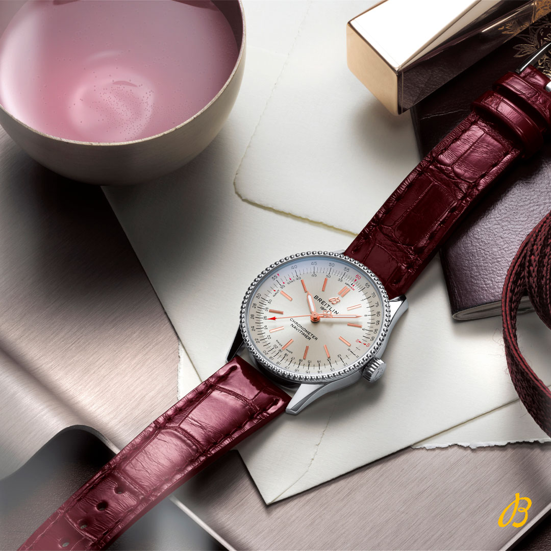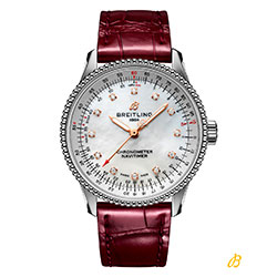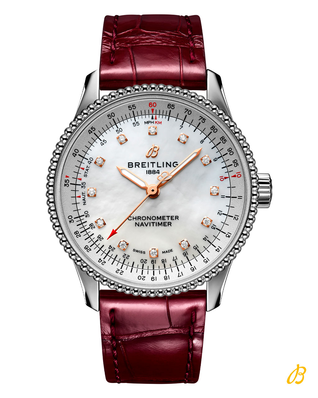 Второй вариант – 35-миллиметровый корпус с циферблатом из белого перламутра и бриллиантовыми часовыми метками. Ремешок из кожи аллигатора выполнен в бордовом цвете, имеет классическую или раскладную застежку. В данном случае часы также могут быть представлены с браслетом Navitimer из нержавеющей стали с раскладной застежкой.