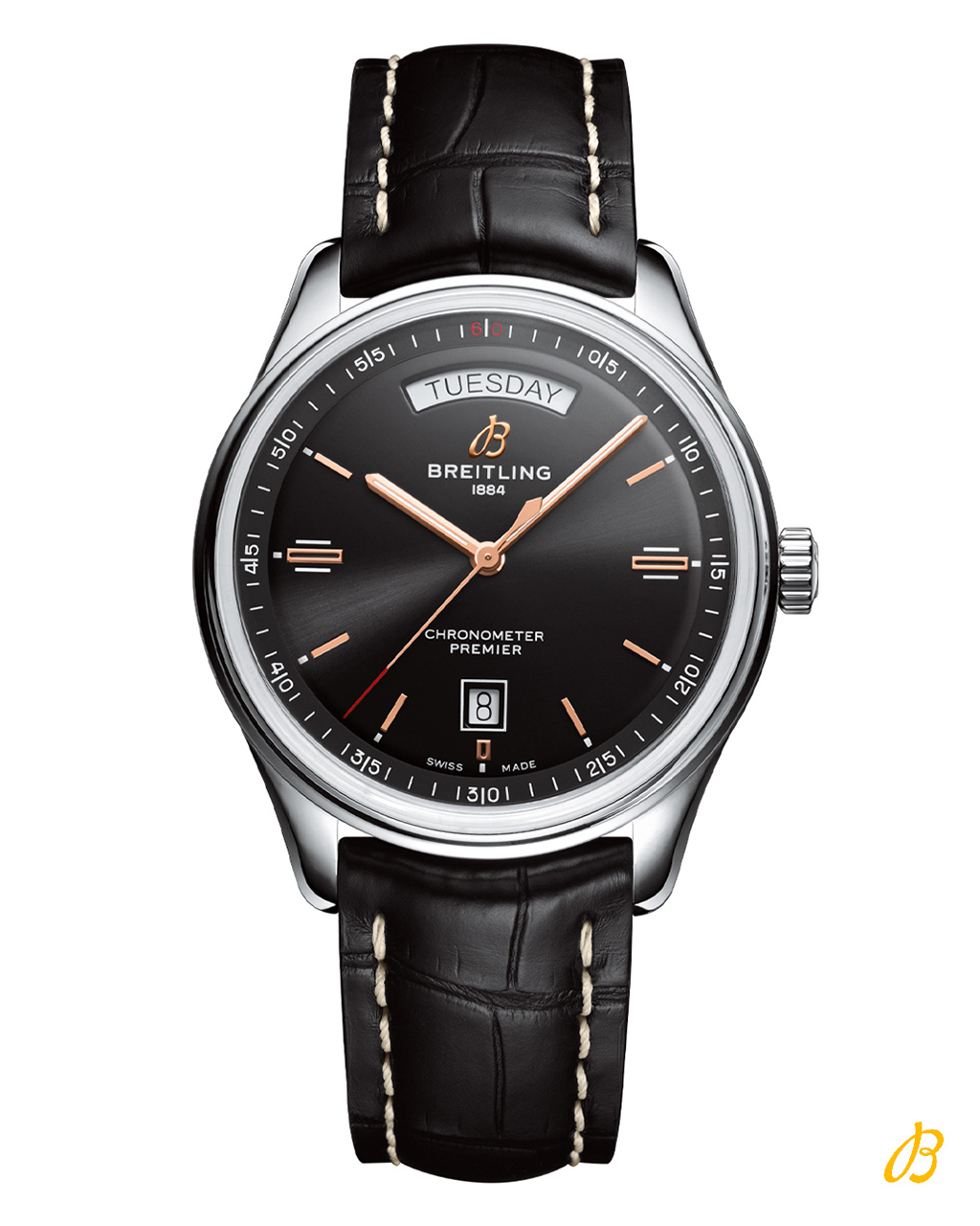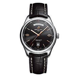 Модель Breitling Premier Automatic Day & Date 40 отображает не только время, но – как на то указывает ее название – также день недели и дату, окошки которых расположены в положениях «12» и «6 часов» соответственно. Эта модель автоматических часов приводится в движение с помощью хронографического механизма с автоподзаводом калибра Breitling Caliber 45. Premier Automatic Day & Date 40 предлагаются с черным или серебристым циферблатом и поставляются с браслетом из нержавеющей стали, ремешком из нубука либо кожи аллигатора с белой прострочкой.