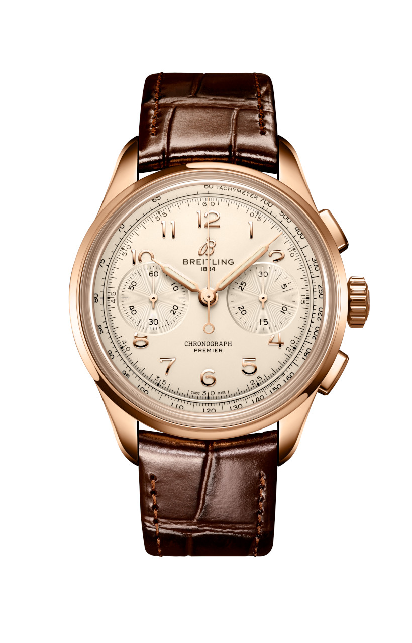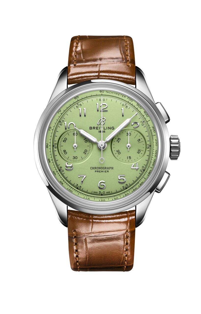 Модель Premier Heritage Chronograph в корпусе диаметром 40 мм обладает ручным подзаводом, как и ее предшественники, увидевшие свет в 40-х годах. Часы оснащены мануфактурным калибром Breitling B09, созданным на основе мануфактурного калибра Breitling 01. Эта модель выпускается в двух вариантах: с привлекательным фисташковым циферблатом в корпусе из нержавеющей стали или с роскошным серебристым циферблатом в корпусе из 18-каратного красного золота.