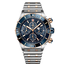 Как и в оригинальной версии Chronomat, райдеры защищены сапфировым стеклом. Те, что расположены у отметок «3 часа» и «9 часов», взаимозаменяемы, поэтому их можно использовать как для обратного, так и для прямого отсчета времени. Смелый характер коллекции Super Chronomat подчеркивается диаметром корпуса 44 мм. В новой модели реализованы такие нововведения, как безель из нержавеющей стали с керамической инкрустацией (впервые в Chronomat) и возможность выбора ремешка – каучукового в стиле Rouleaux или оригинального металлического с клипсой-бабочкой. Новый каучуковый ремешок создан с использованием новейшей технологии литья под давлением. Представлены три варианта текстуры – матовая, глянцевая и в стиле плетения – они придают модели особый стиль.