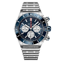 Часы Super Chronomat B01 44 выполнены в трех вариантах. Два – в корпусе из нержавеющей стали с черным или синим цветом циферблата и безеля. Третий вариант модели сочетает в себе насыщенный коричневый оттенок циферблата и безеля и корпус из 18-каратного красного золота. Все экземпляры часов оснащены контрастными серебристыми счетчиками хронографа и мануфактурным калибром Breitling 01, сертифицированным Швейцарским институтом официального тестирования хронометров (COSC) и обладающим запасом хода около 70 часов. Водонепроницаемость этой модели Super Chronomat составляет до 200 метров.