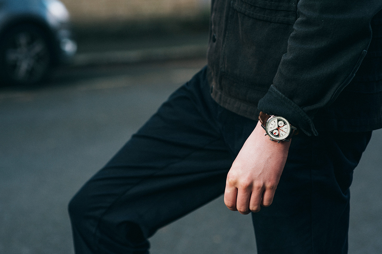 Хронограф: качающийся триб, 1/4-секундный и 30-минутный счетчики.