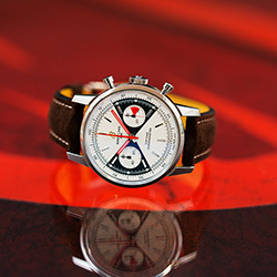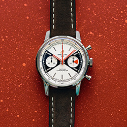 Внутри корпуса из нержавеющей стали диаметром 41 мм находится механизм с функцией хронографа Breitling Caliber 23, запас хода которого составляет около 48 часов. Его высокая точность подтверждена сертификатом Швейцарского института официального тестирования хронометров (COSC). На часовую и минутную стрелки красного цвета, а также круглые часовые метки нанесено люминесцентное покрытие по технологии Super-LumiNova®, что позволяет считывать показания времени при любом уровне освещенности. Помимо трех центральных стрелок (часовой, минутной и секундной стрелки хронографа) циферблат оснащен десятичной шкалой и двумя малыми счетчиками. Один из них, секундный, размещен напротив отметки «9 часов», а второй, 30-минутный, с необычными акцентами красного цвета – напротив отметки «3 часа». Коричневый ремешок из нубука напоминает об истории создания модели и подчеркивает ее ретростилистику. Эти уникальные часы выпущены ограниченной серией в 2000 экземпляров. На задней крышке корпуса каждого из них выгравирована надпись «ONE OF 2000».