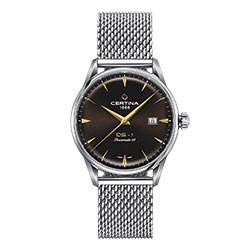 Лаконичный дизайн DS-1 делает эту модель воплощением современной классики в коллекции Certina. Стальной корпус из нержавеющей стали диаметром 40 мм обрамляет выпуклый циферблат темно-синего, шоколадно-коричневого или светло-серого цвета, дополненный гильоше «Солнечные лучи» и фацетированными часовыми отметками. Каждый из трех вариантов исполнения имеет свой уникальный характер.