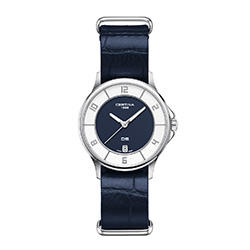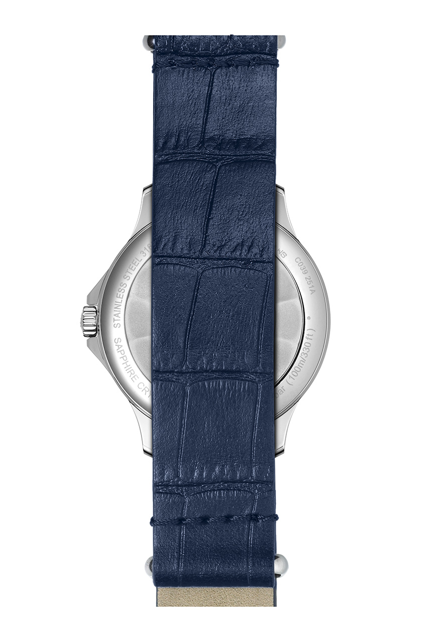 • C039.251.17.047.00 Белый безель, синий циферблат, ремешок из экологичного материала.