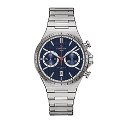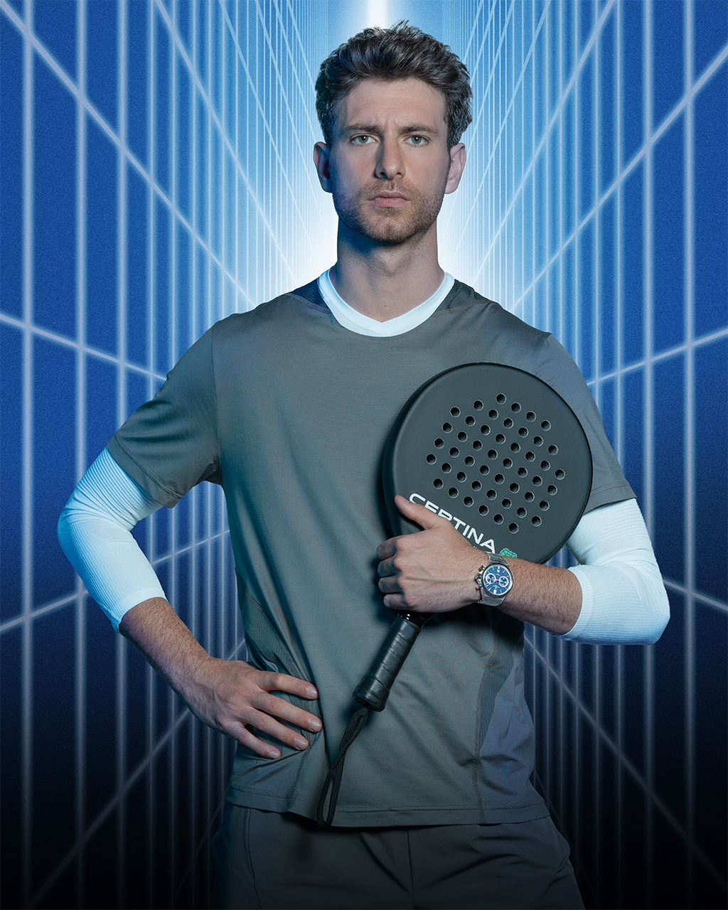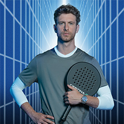 Циферблат выполнен в стиле падель-корта: объёмная сетка-текстура, крупные стрелки и счётчики хронографа создают образ скорости и движения. Автоматический механизм VALJOUX A05.231 с кремниевой пружиной баланса устойчив к магнитным полям, перепадам температуры и ударам: стабильность, рассчитанная на ритм спорта.