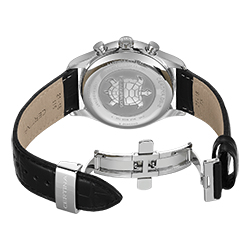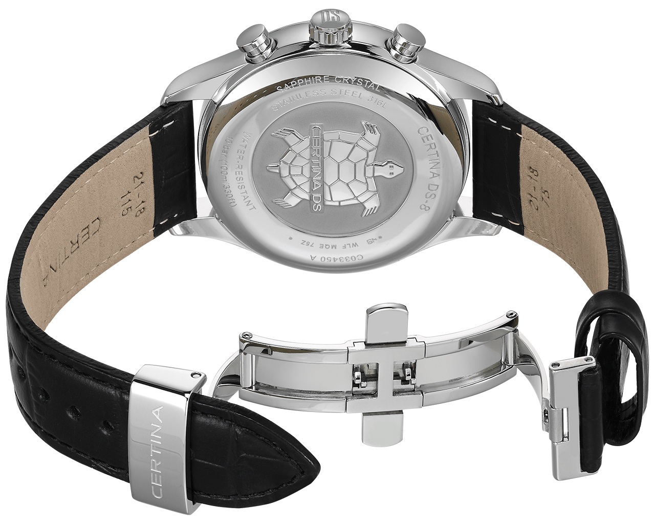 Новая модель DS-8 Chronograph Moon Phase оснащена усовершенствованным кварцевым часовым механизмом PrecidriveTM, хронометрическая точность хода которого подтверждена независимым швейцарским агентством COSC. Механизм надежно защищен системой двойной надежности DS, которая включает сапфировое стекло с антибликовым покрытием и устойчива к появлению царапин.