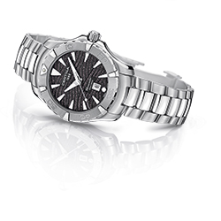 Черный циферблат, декорированный стразами, дополнен окошком даты на отметке «6 часов». Его украшает эффектный волнообразный рисунок. Браслет из нержавеющей стали, состоящий из трех рядов звеньев, имеет раскладывающуюся застежку и регулируемое удлинение для дайвинга. Это обеспечивает надежную и комфортную фиксацию на запястье.