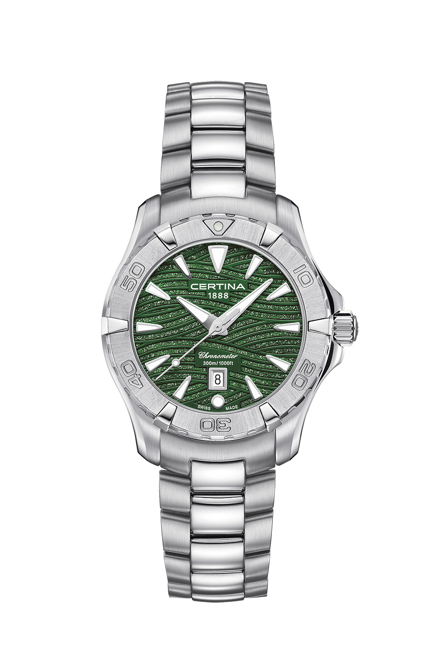 Коллекция DS Action Lady от Certina всегда была связана с водной стихией. Водонепроницаемость до 30 бар (300 м), ультрапрочный корпус и однонаправленно вращающийся безель делают эту модель уместной как на пляже, так и на переговорах. Она станет безупречным спутником и в офисе, и в бассейне. Синие и зеленые циферблаты этих женских часов дополнены декором в виде сверкающих волн.