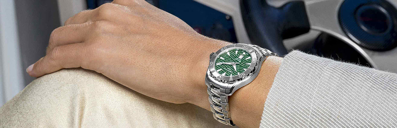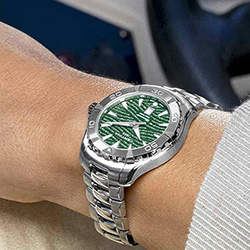 • Изумрудно-зеленый циферблат с напечатанным декором в виде волн и инкрустацией стразами.