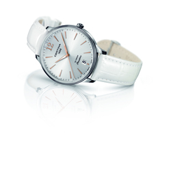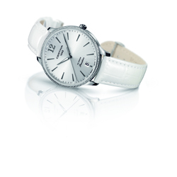 • белый ремешок имеет версия с серебристым циферблатом, метками и стрелками с PVD-покрытием розовым золотом и версия с серебристым циферблатом, чёрными никелированными стрелками и метками, 120 бриллиантами «Top Wesselton» по безелю;