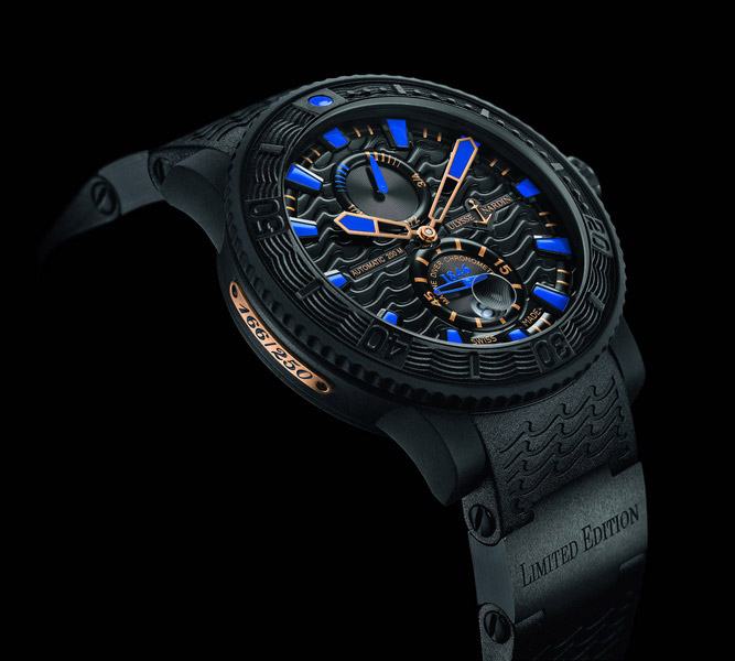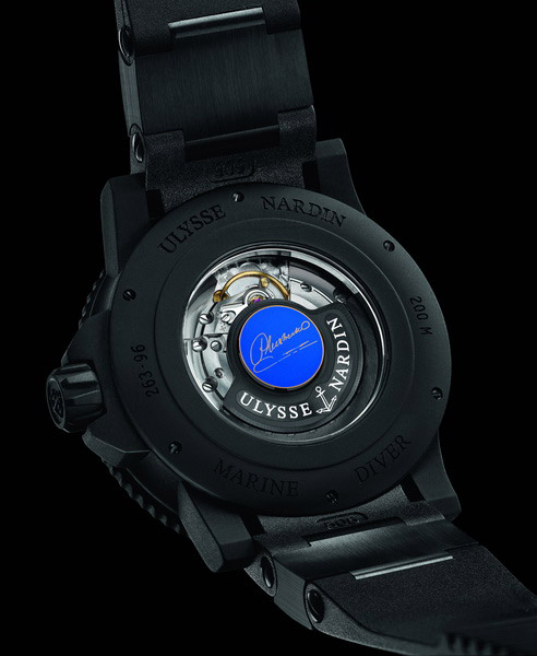 Из такого же материала выполнена и прозрачная задняя крышка часов. Завершающим штрихом новой модели являются золотые метки на безеле и золотая, фиксируемая на резьбе заводная головка.