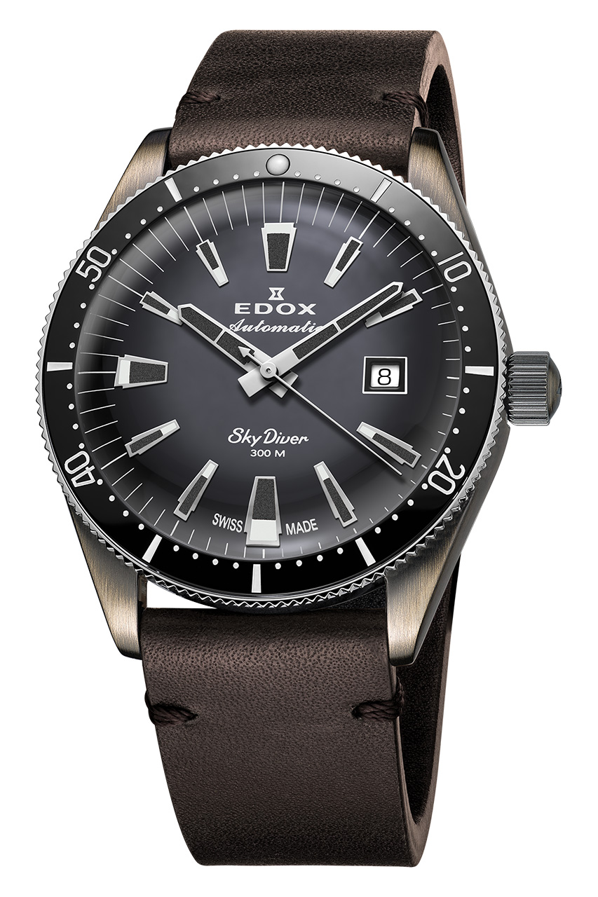 Еще одним «винтажным» штрихом является специальное покрытие, нанесенное на ремешок из серой кожи. Покрытие создает «складки» на ремешке – еще один ностальгический штрих. SkyDiver Date Automatic также поставляется с альтернативным ремешком из коричневой кожи, который можно легко заменить. Под капотом находится механизм с автоподзаводом Edox Calibre 80, изготовленный швейцарским специалистом Sellita, а внешний керамический безель, устойчивый к царапинам, обеспечивает практичный инструмент для расчета времени погружения на глубину до 300 метров ниже уровня моря.