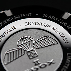 Военный стиль пронизывает всю ДНК SkyDiver – от полуматового циферблата до цельной задней крышки, на которой гордо изображена эмблема парашютно-десантного подразделения. SkyDiver Limited Edition дополняет военный стиль практичной функциональностью для любых приключений – будь то на суше, на море или в воздухе, включая керамический, устойчивый к царапинам безель для дайвинга и водонепроницаемость до 300 м.