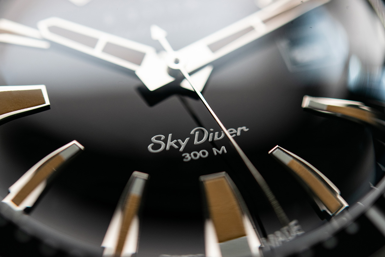 Коллекция SkyDiver посвящена десантникам и экстремальным условиям, с которыми они могут столкнуться на суше, в воздухе или на море. Надежные часы SkyDiver, выполненные в винтажном военном стиле, защищены устойчивым к царапинам сапфировым стеклом и корпусом из нержавеющей стали. Водонепроницаемые до 30 атм/300 м, часы SkyDiver останутся читаемыми на такой глубине благодаря высокому стандарту ночной видимости на часах Super-LumiNova, который покрывает его стрелки и индексы. SkyDiver — это часы ручной сборки, готовые к настоящим приключениям.
