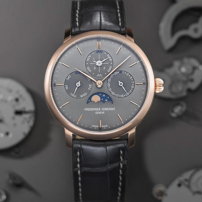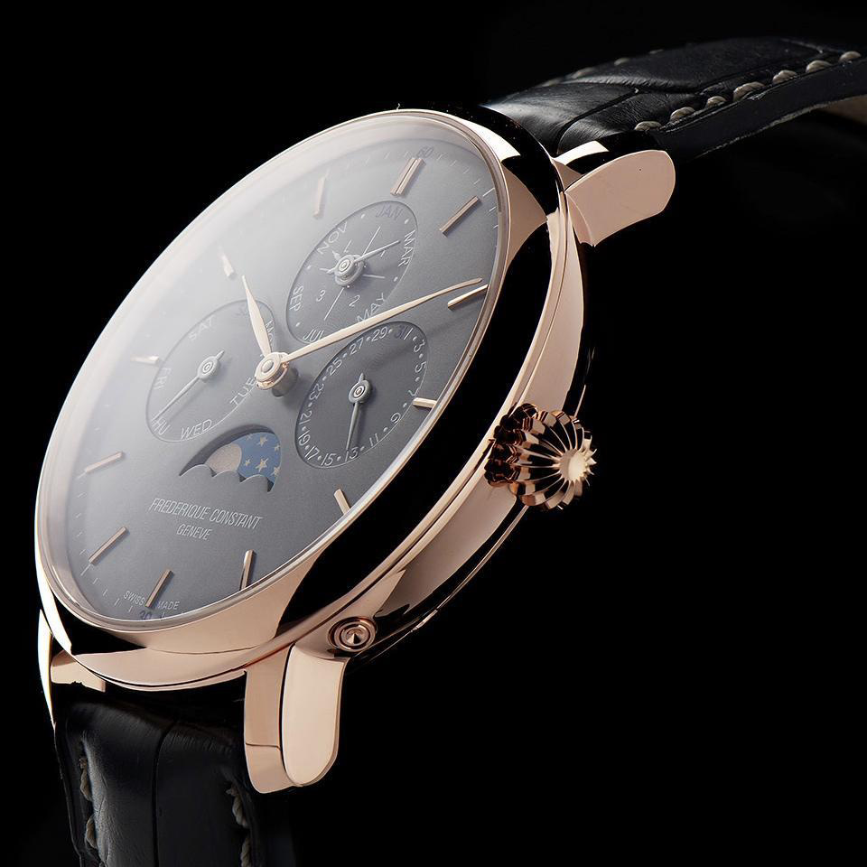 Каждое отдельное осложнение можно легко изменить с помощью корректоров. После корректировки этот чрезвычайно сложный механизм будет учитывать месяцы с 30 и 31 днями, 28 днями февраля, а также цикл високосного года с возвращением 29 февраля каждые четыре года. Обычно эти часы не должны требовать ручной коррекции до 400 лет. Но так как в Григорианском календаре есть исключение, часы нужно скорректировать 1 марта 2100 года. Производство вечного календаря Frederique Constant Slimline Perpetual Calendar Manufacture предлагает четкое чтение, включающее месяц, дату, день недели и год, а также часы, минуты, високосный год и индикатор фазы луны.