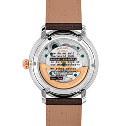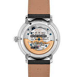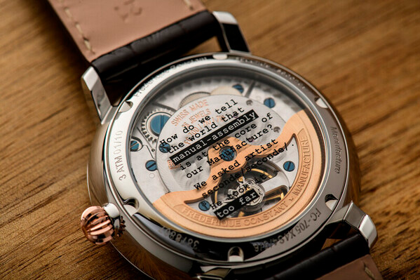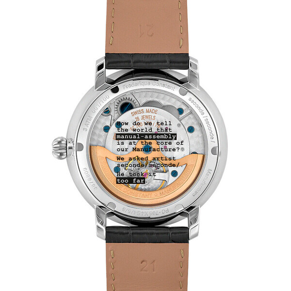 На задней стороне корпуса можно увидеть забавную гравировку, описывающую суть коллаборации: «Как рассказать миру о том, что часы собираются вручную? Мы спросили seconde/seconde/, и он зашел слишком далеко». Сквозь прозрачную заднюю крышку открывается вид на автоматический калибр FC-705 с запасом хода 38 часов, декорированный узорами "Женева" и синими винтами.