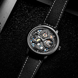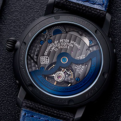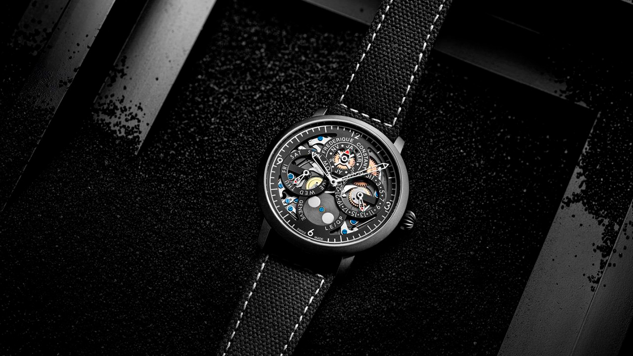 В этой ограниченной серии, насчитывающей всего 35 экземпляров, все элементы часов выполнены в строгом черном цвете. Черный корпус, ремешок и ажурный циферблат подчеркивают утонченную работу механизма FC-775, демонстрируя сочетание женевского мастерства и британской дерзости. Сатинированные детали, вороненые винты и сапфировое стекло на задней крышке делают эту модель воплощением высокого часового искусства, что делает эту модель коллекционной.