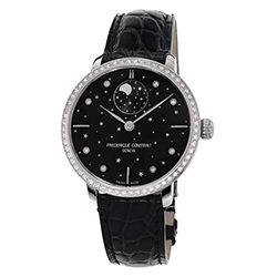 Компания Frederique Constant верна своим традициям при создании новой модели. Часы отличаются элегантностью и техническим совершенством: индикация фаз луны сочетается с изысканной отделкой и великолепием усыпанного бриллиантами безеля. Slimline Moonphase Stars Manufacture выпускается в стальном корпусе с покрытием из розового золота или в корпусе из стали диаметром 38,8 мм. Безель часов инкрустирован 60 бриллиантами (0,5 карата). Прозрачная задняя крышка позволяет наблюдать за работой автоматического мануфактурного калибра FC-701, украшенного зернением и узором Côtes de Genève. Данный калибр, как и его предшественники серии FC-7XX, дает возможность регулировать все функции с помощью одной заводной головки. Это удобство непременно оценят обладательницы часов.