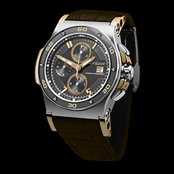 1. Hysek Abyss 44mm Chronograph 10th Anniversary Gold AB4402B01: серый титановый корпус, золотистый безель, серый циферблат, коричневый кожаный ремешок. |