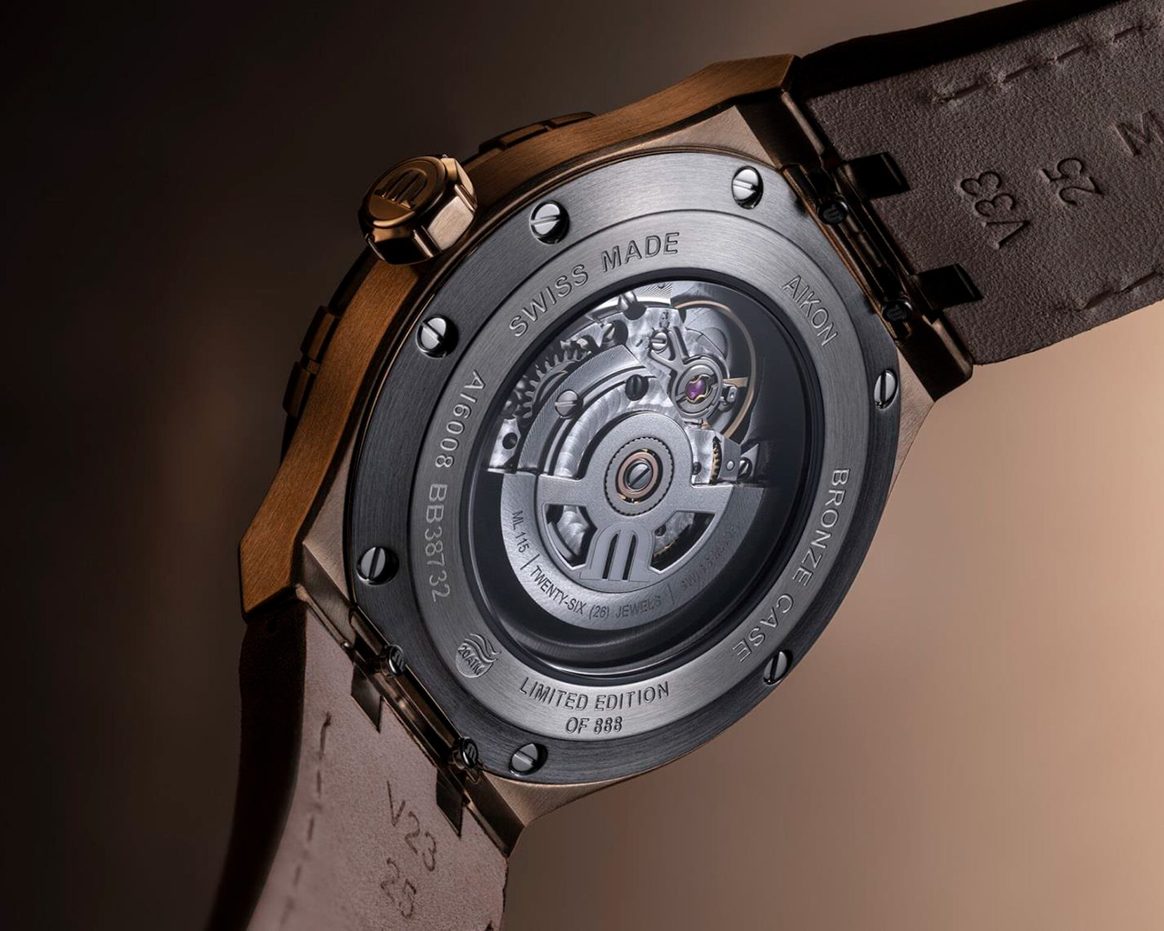 AIKON Automatic Bronze поставляется в прочном бронзовом корпусе диаметром 42 мм, дополненном райдерами на безельной части, которые незаметно добавляют глубину и характер. С высотой корпуса 11 мм присутствие на запястье остается изысканным и ненавязчивым, но властным. Открытая задняя крышка, изготовленная из нержавеющей стали, предлагает захватывающий вид на внутренности часов. С водозащитой 20 атмосфер AIKON Automatic Bronze готов к любым приключениям в любых условиях.