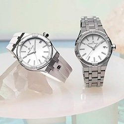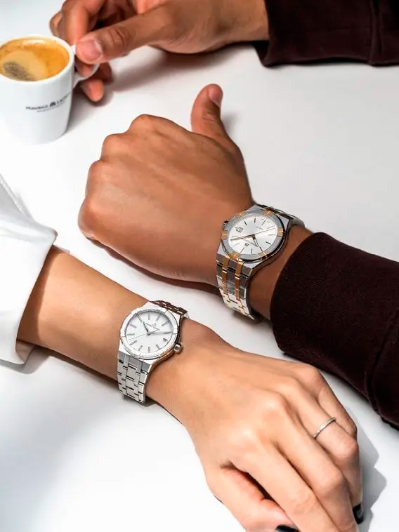 Maurice Lacroix также представляет новый двухцветный AIKON, представленный в корпусе диаметром 40 мм. Шесть рычагов, охватывающих безель из нержавеющей стали, отделаны золотом 4N PVD, что придает композиции теплоту. Серебристый циферблат, матовый от солнца, служит фоном для золотых стрелок и индексов, которые ярко сияют даже в пасмурный день. Отверстие для даты в положении «3 часа» также обрамлено золотом 4N PVD, что усиливает общее ощущение роскоши. Наконец модель представлена на пятирядном двухцветном браслете, завершающем образ этого стильного ансамбля.