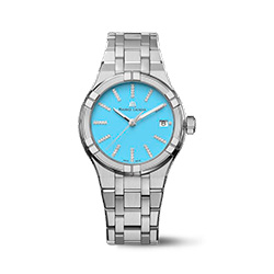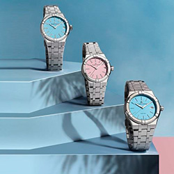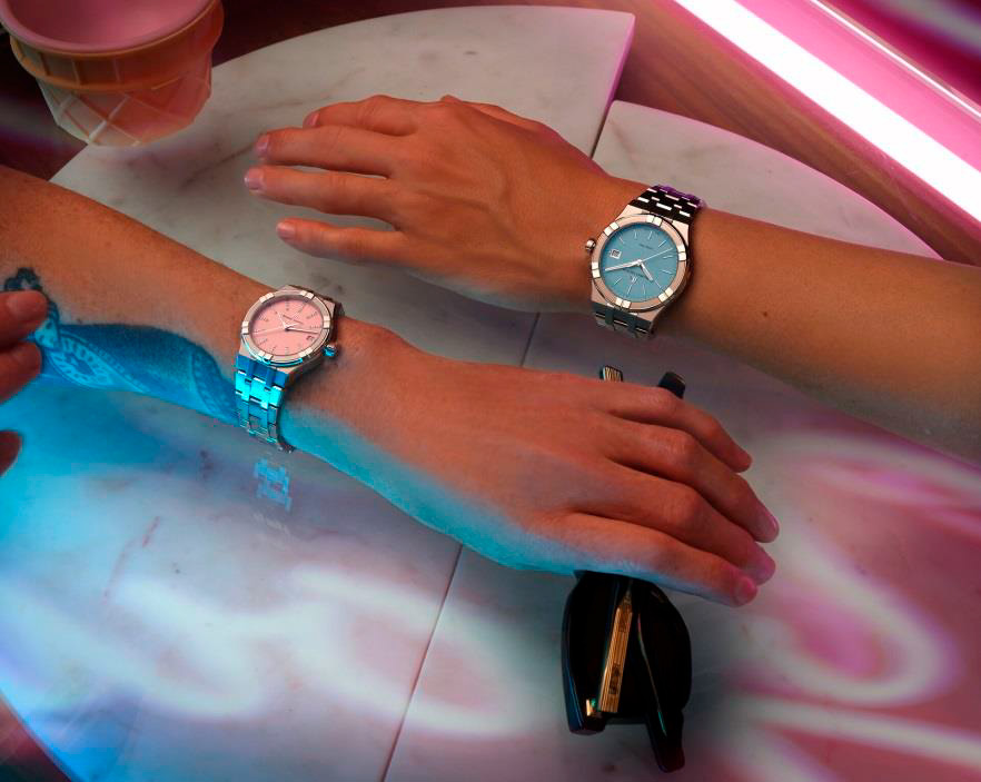Коллекция представлена тремя моделями. Первая — это 35 мм версия AIKON Quartz в цветах Sunset Pink и Deep Sky Blue, которая словно создана для моментов, полных радости и романтики. Индексы, украшенные бриллиантами, мерцают, напоминая о том, как ночное небо переливается под звездами. Вторая модель, диаметром 40 мм, также выполнена в оттенке Deep Sky Blue и идеально подходит как для ярких солнечных дней, так и для вечеров в свете ночных огней.