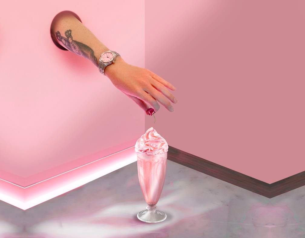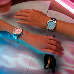Создание AIKON Quartz Colours Edition началось с mood board — инструмента, часто используемого для генерации идей. Вдохновленные пейзажами побережья Флориды, дизайнеры представили нежные голубые воды, солнечные пляжи и архитектуру в стиле ар-деко, украшенную хромом и неоновыми огнями. Внутри студии на флип-чарте возникли такие слова, как "гламур", "блеск", "теплота" — все они воплотились в новых часах.