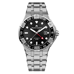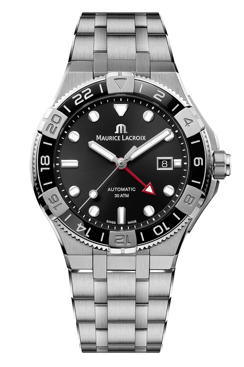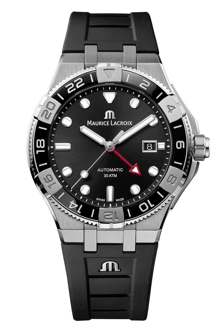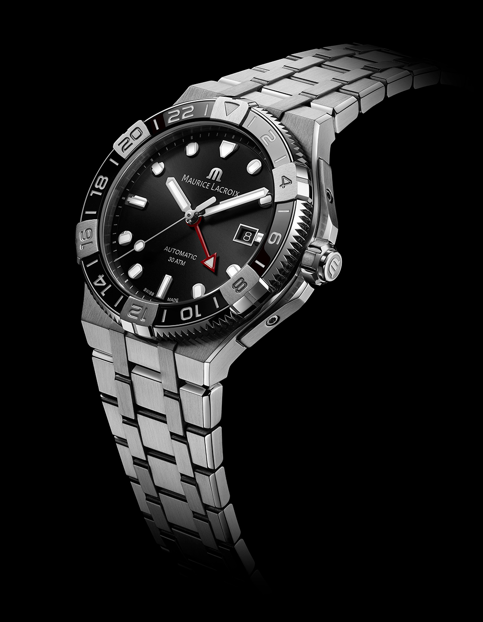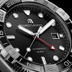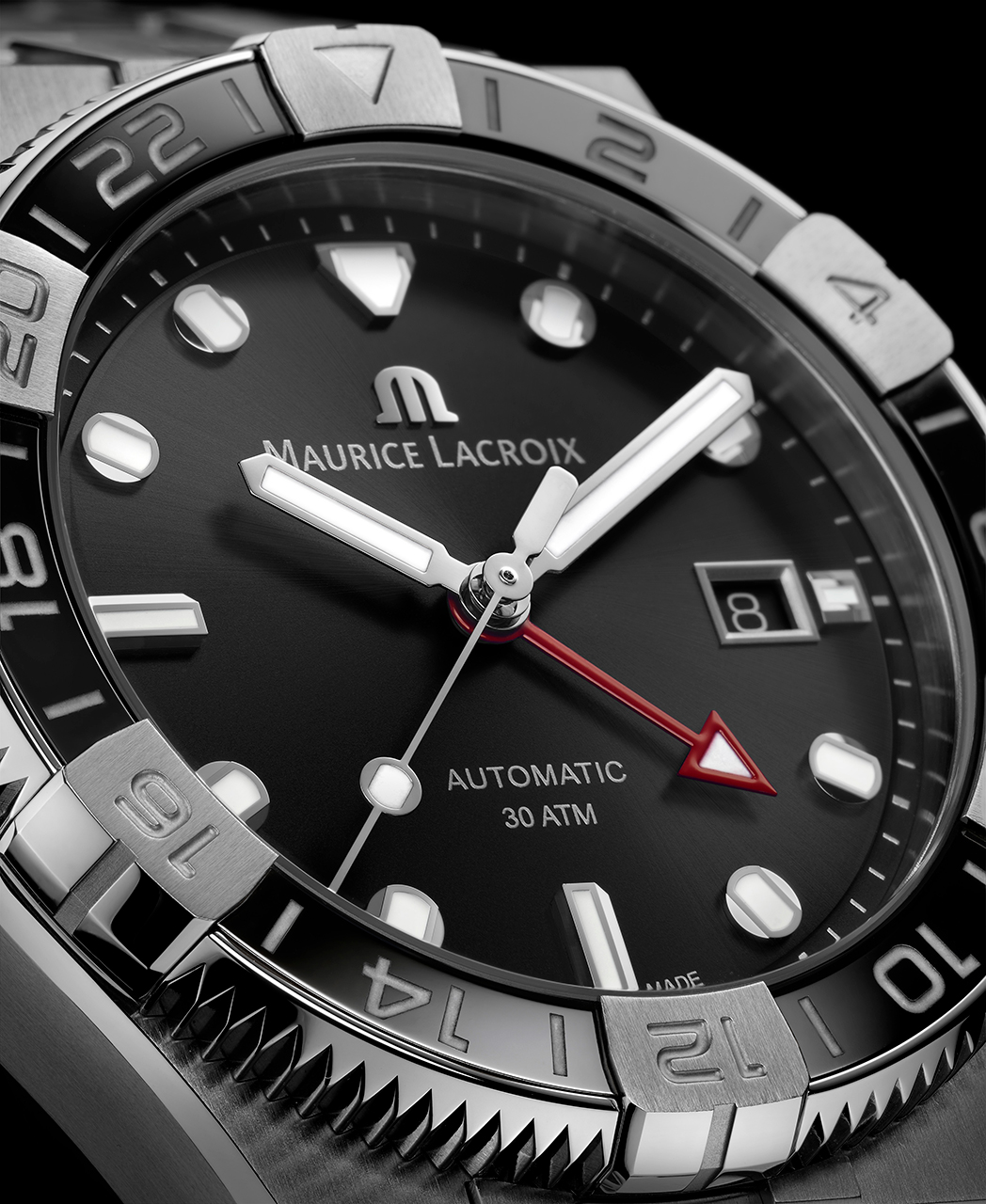 Функциональность модели AIKON Venturer GMT обусловлена применением лучших часовых технологий Maurice Lacroix. Автоматический калибр ML 165 (с индикацией даты, часов, минут, секунд и второго часового пояса в 24-часовом формате) характеризуется повышенной прочностью, надежностью и показателем водонепроницаемости 300 метров – необходимые свойства для часов современного путешественника. Для большей контрастности и оптимальной читаемости показаний стрелка GMT окрашена в красный цвет, а циферблат – в черный, с применением отделки «солнечные лучи». На нем ярко выделяются метки округлой формы с люминесцентным покрытием SuperLumiNova. Однако самое значительное изменение в новой версии AIKON Venturer GMT – это безель.