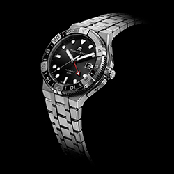 В линейке AIKON Venturer шесть выступов на безеле – характерная декоративная особенность коллекции AIKON. Они стали выполнять функциональную роль: не только защищают, но и позволяют удобно вращать однонаправленный безель из керамики – высокотехнологичного материала, устойчивого к появлению царапин. В версии GMT безель имеет 24-часовую разметку, по которой скользит стрелка второго часового пояса. Она делает полный оборот вокруг циферблата за сутки.