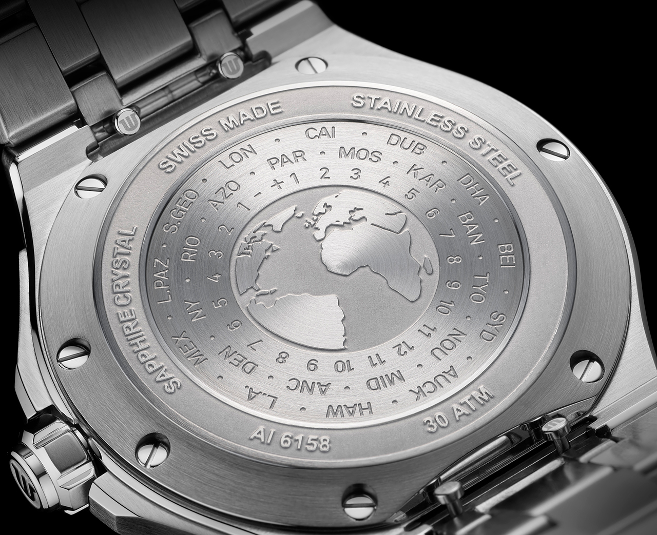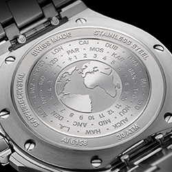 Корпус выполнен из стали, поверхности его сатинированы, а полированная кромка эффектно обрисовывает силуэт часов. Самое важное кроется в деталях: задняя крышка часов AIKON Venturer GMT украшена гравированным изображением карты мира с разметкой основных 24 часовых поясов. Интегрированный пятирядный стальной браслет оснащен системой Easychange, благодаря которой его можно легко снять и заменить. А со вторым ремнем – из каучука с геометрическим узором часы AIKON Venturer GMT приобретают выраженный спортивный стиль.