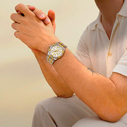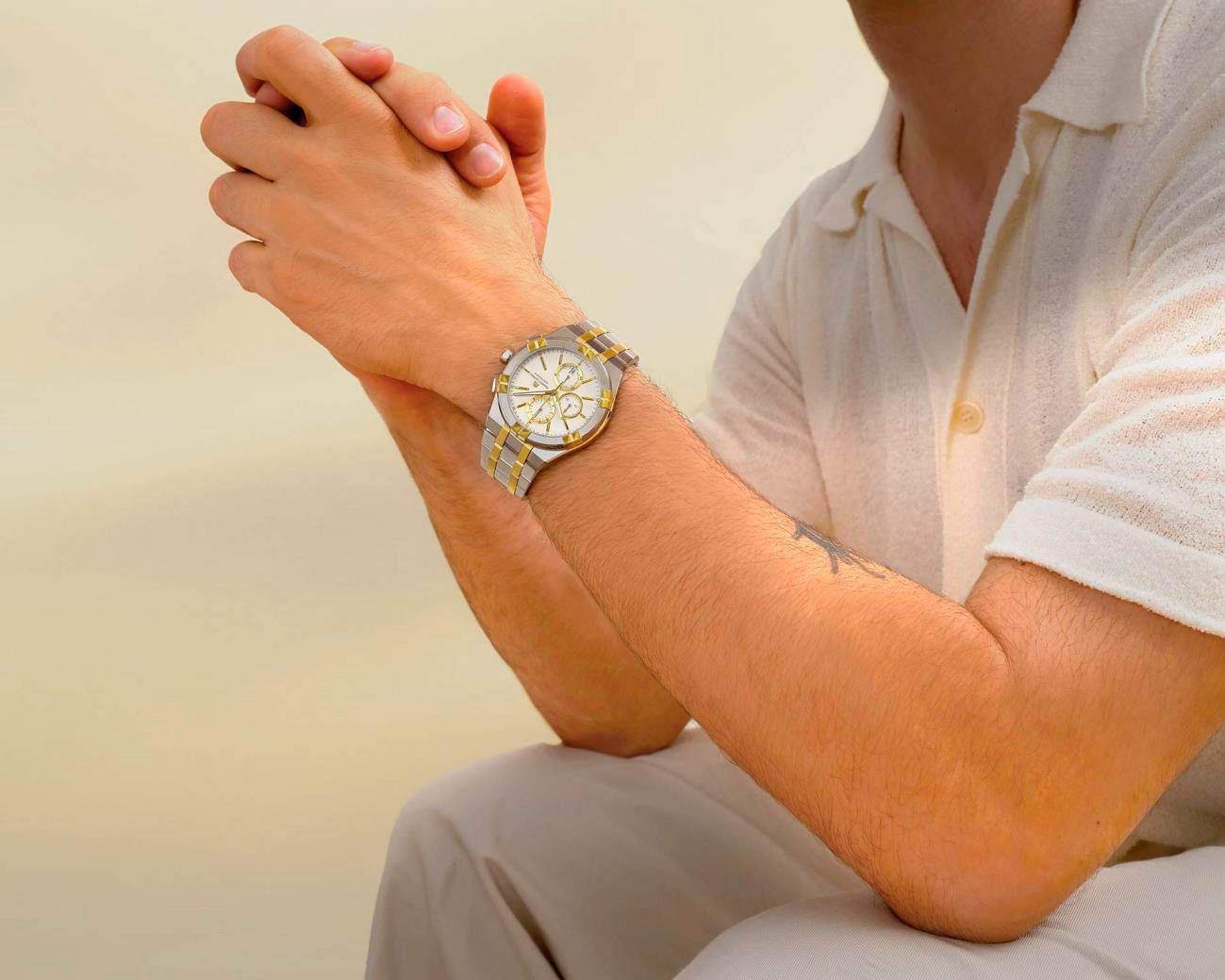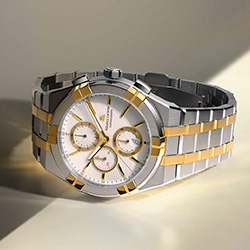 • AIKON Quartz Chronograph Duotone — выбор для тех, кто сочетает активный образ жизни с утончённым вкусом. Этот хронограф выделяется контрастом золотых индексов и серебристых тонов.