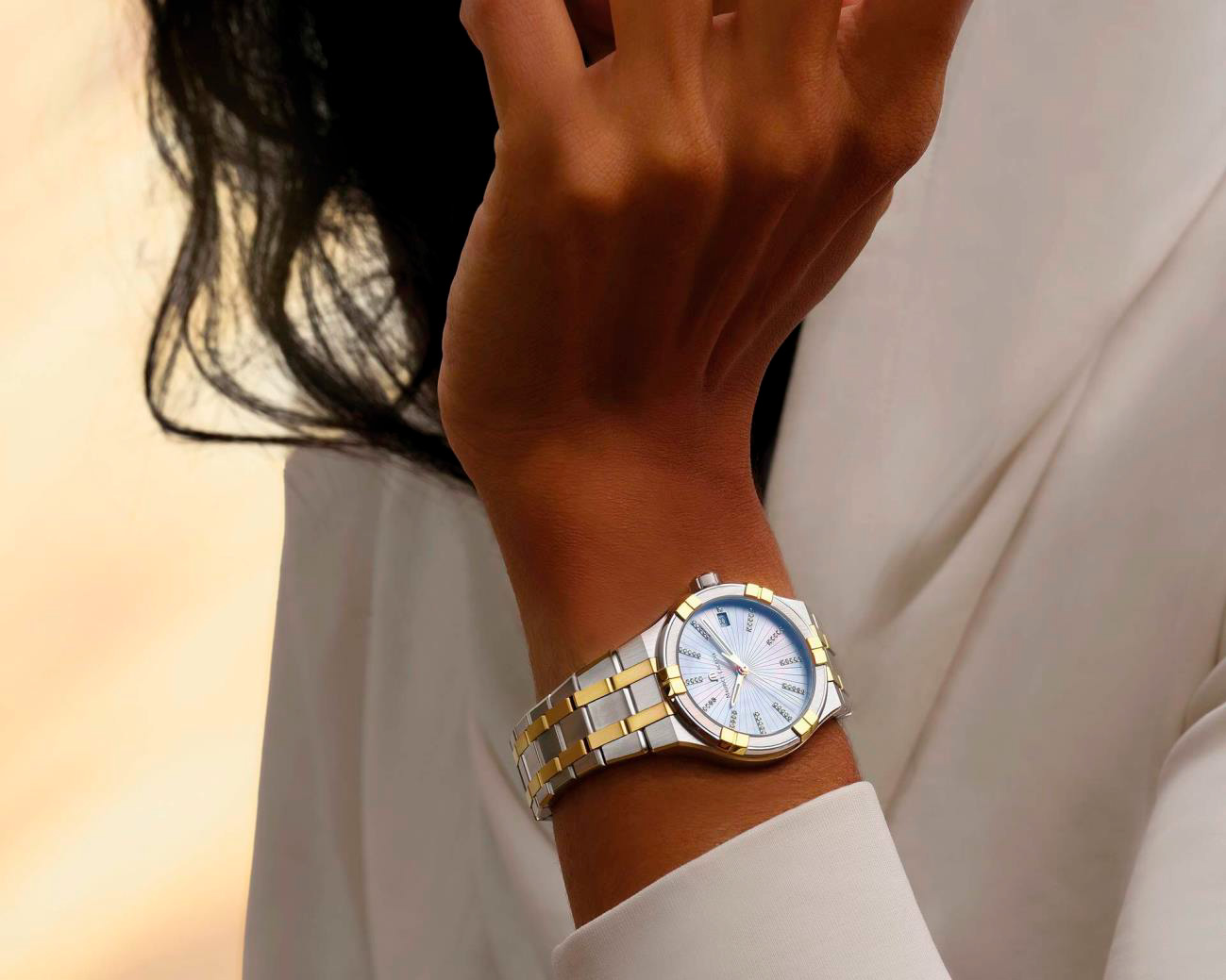 - Материал корпуса: Нержавеющая сталь с чередованием золотых и серебристых тонов