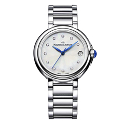 6. Модель FA1004-SS002-170-1: стальной корпус диаметром 32 мм; перламутровый циферблат с тремя синими стрелками и одиннадцатью бриллиантами; стальной браслет.