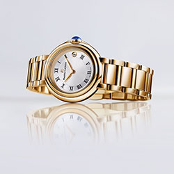 Серебристые циферблаты позолоченных моделей меньшего размера оснащены центральными стрелками часов и минут, а на серебристых циферблатах позолоченных моделей большего размера установлены центральные стрелки часов минут и секунд. Стрелки серебристых циферблатов отделаны также как и корпус – PVD-покрытием из розового золота. Все серебристые циферблаты имеют окошечко даты на отметке «3 часа».