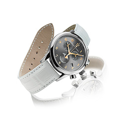 Корпус из полированной нержавеющей стали с бриллиантовой инкрустацией. Антрацитовый сатинированный циферблат с центральными стрелками, накладными арабскими цифрами и малыми стрелками минут и секунд, покрытыми родием. Белый ремешок из натуральной кожи с раскладывающейся застёжкой из полированной нержавеющей стали.