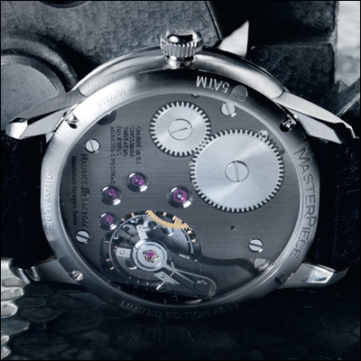 Главное, что поражает в часах больше всего – это сочетание авангардной мысли и классической часовой механики. Мануфактурный калибр «ML 153» с ручным заводом, который можно наблюдать сквозь сапфировое окно на задней крышке, создан в соответствие со всеми канонами часового искусства: большой зрелищный баланс, унаследованный от карманных часов, мосты с ручной гравировкой «женевские волны», воронёные винты и рубиновые кабошоны. Даже самая маленькая деталь в этих часах выполнена с высочайшей точностью и вниманием.